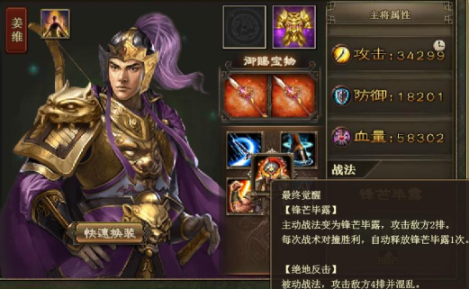 对于觉醒后的姜维,装备的选择会更加讲究。神姜维套装是专为他设计的,能全面提升攻击力、防御力和命中率,让他在战场上更加全面。如果对手阵容中有司马懿这类高爆发武将,建议搭配灵龟套装来增加生存能力;如果没有的话,烛龙套装或者霸下套装也是不错的选择。觉醒姜维的装备搭配需要根据对手的阵容灵活调整,这样才能最大化他的战斗力。张飞和姜维都是核心输出,所以他们的装备要尽量弥补队伍的短板。比如如果队伍缺乏防御,可以给姜维搭配更多生存向的装备;如果队伍需要爆发,张飞的驱虎套装就是更好的选择。