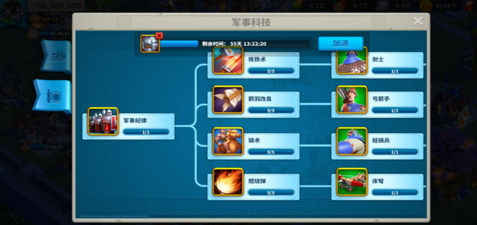 科技研发是推动时代晋升的另一关键因素。经济类科技优先提升采集速度、建造加速等实用属性,而军事科技则侧重兵种强化与训练加速。建议平民玩家优先完成经济科技中的数学和机械分支,再逐步解锁军事科技的草药学和战斗策略,以确保资源生产与战斗力的平衡发展。科研加速道具应集中用于耗时较长的高阶科技,避免浪费在低效项目上。联盟科技加成和符文增益可进一步缩短研发周期,积极参与联盟活动能稳定获取相关加速资源。
