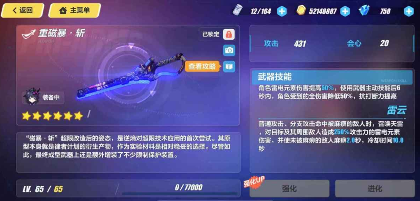 重磁暴·斩是崩坏33.4版本登场的超限武器,由磁暴·斩改造而来,属于逆熵对超限技术的首次尝试。作为6武器,其基础攻击力431,会心20,定位为雷电元素特化型太刀。该武器原型为律者计划衍生产物,最终成品额外加装了限制保护装置以确保稳定性。核心机制围绕雷电元素伤害增幅、麻痹控制与生存能力提升展开,尤其适配雷电女王的鬼铠角色。