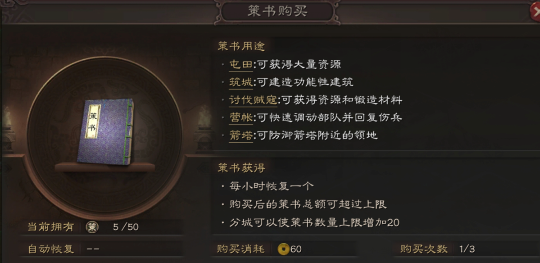 屯田需要消耗两种关键资源,分别是策书和武将体力。每次屯田固定消耗3个策书和15点体力,而且策书这个东西每小时才自动恢复1个,算是比较稀缺的,除了屯田,后面筑城、讨伐贼寇等行动也要用到它,所以不能无节制地乱用。
