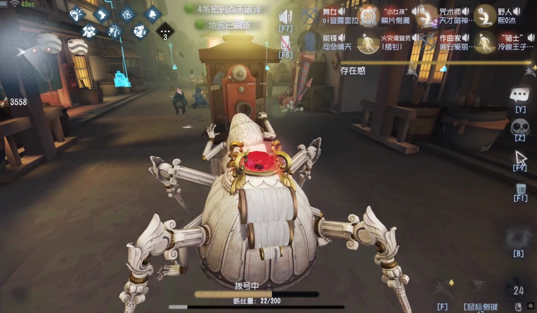 因为这个模式节奏快,人类修机压力大,开局可以尝试快速找到并追击一个目标。蜘蛛前期正面追击能力不弱,利用好你的蛛丝技能去限制人类走位。记得要时刻留意脚下,你自己铺的蛛丝和喷出的丝都能给你带来加速效果,帮你快速转点。如果和另一个监管者队友有沟通,可以尝试配合,比如你抓到人后,队友可以帮忙守一下,让你腾出手来继续追击。
