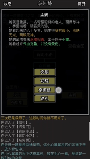 孟婆奈何桥任务通过对话接取,系统会给150秒时间处理六个选项,上方会显示鬼魂的人名和生平简介,玩家需根据描述选择对应交互方式,例如对生平一般或善良的鬼魂使用坦诚相告或好言相劝,对恶人则出言威逼,对穷人用以利诱之,投胎人数越多奖励的冥币也越多,最高可达814亿,每周三次机会,合理选择策略能有效提升完成数量,比如优先避免战斗选项以节省时间,因为战斗可能触发逃跑增加不确定性。