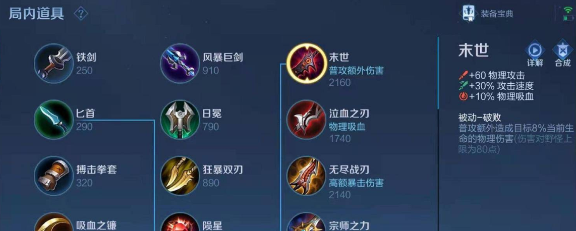 核心装备一定是末世,这件装备简直是给老虎量身定做的,它提供的物理攻击、攻击速度和物理吸血属性都非常全面,最关键的是它的被动破败,普攻能附带敌人当前生命值百分比的伤害,这让人形态的老虎远程消耗能力和打坦克的能力都上了一个台阶,可以说出了末世的老虎才算真正开始有伤害。做完末世之后,接下来可以选择暗影战斧或者宗师之力。暗影战斧能提供冷却缩减、生命值和物理穿透,让你的技能转得更快,同时切脆皮也更疼,是一件非常均衡的装备。而宗师之力则侧重于爆发,它的强击被动在使用技能后能强化下一次普攻,特别适合老虎这种频繁切换形态、不断使用技能的英雄,切换形态后接的那一下强化普攻伤害会非常高。
