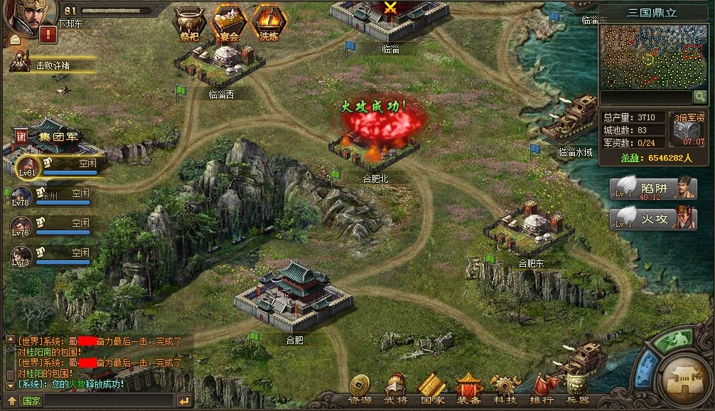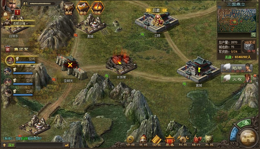 文官还拥有独特的计策系统,这些计策在战斗中能带来意想不到的效果。比如火攻、水攻、空城和陷阱等,可以在国战或对城攻击时减少敌方兵力或施加增益效果,从而扭转战局。这些计策种类丰富且具有不同级别,玩家可以在战斗中灵活运用,例如在特定地形上针对敌人弱点施展计策,从而节省自身兵力和资源。文官作为军师随行,能及时触发这些技能,让战斗过程更加多变和富有策略性。