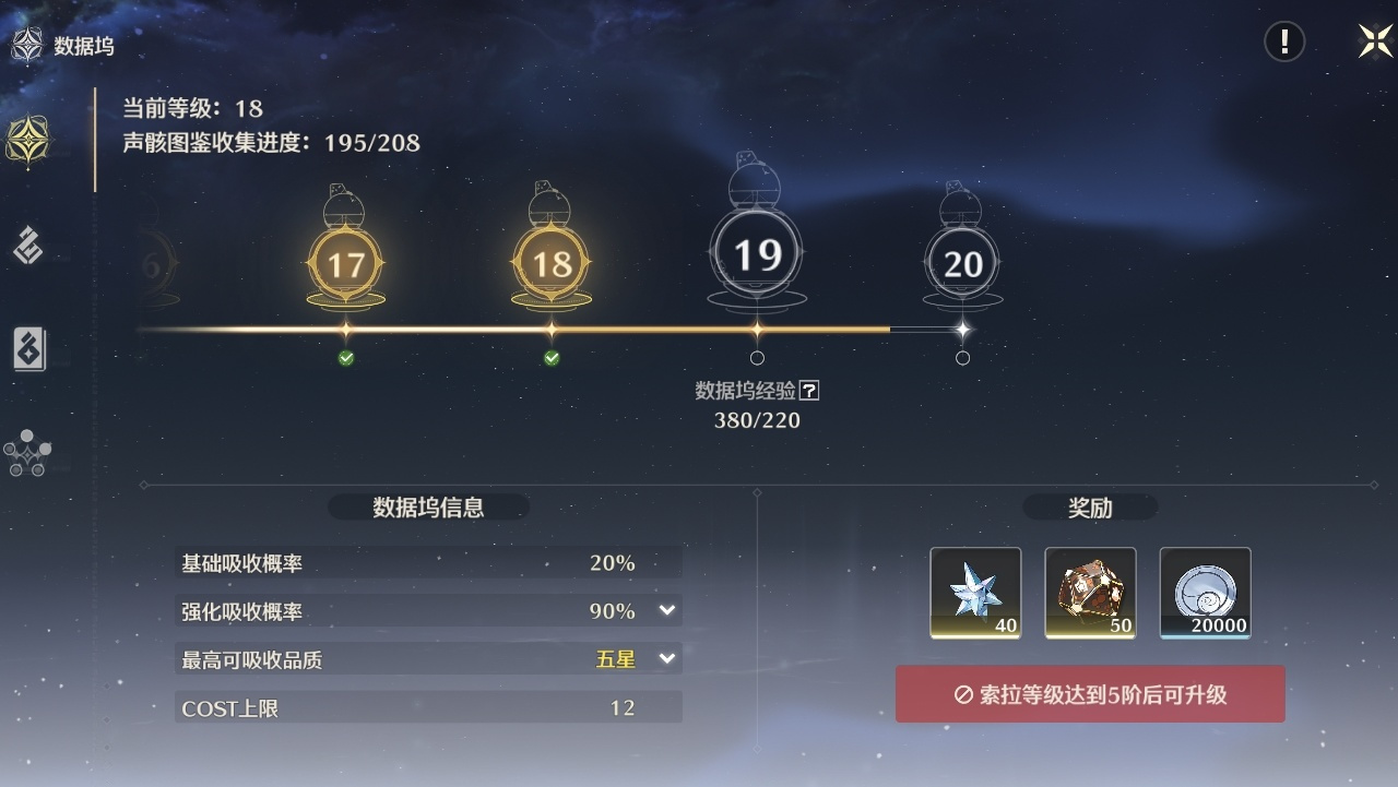 高效获取声骸需要优先提升数据坞等级,这通过收集不同类型的声骸和挑战无音区来实现。数据坞等级越高,玩家获得金色声骸的概率就越大,同时声骸的cost等级上限也会提高。建议玩家在联觉等级达到一定阶段后,集中挑战散发黑气的红名怪物,这些怪物必掉声骸且经验值较高。