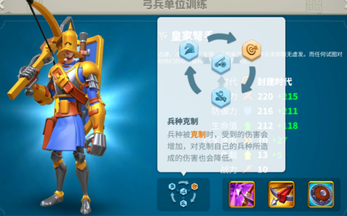 弓兵在守城战中能发挥远程火力优势,尤其当城墙和防御塔较为坚固时,弓兵可依托地形进行远距离输出。弓兵对步兵有显著克制效果,但生命值极低且惧怕近战突袭,面对骑兵冲锋或大规模进攻时防守稳定性不足。弓兵更适合作为辅助兵种配合步兵驻防,通过火力压制延缓敌方进攻节奏。