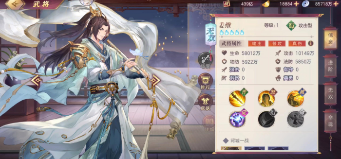 武将培养方面,集中资源提升核心武将的星级和装备是关键。初期建议优先培养1-2个主力输出型武将,如姜维、王元姬等,搭配曹仁、鲁肃等辅助型武将形成基础阵容。神兵选择上,弓和葫芦优先提升至五星,后续可根据阵容需求补充和氏璧等辅助型神兵。将魂系统建议优先点满抗性属性,再逐步激活攻击属性,注意优先选择将魂数量较多的节点。战魂搭配需根据武将定位选择,输出型武将适合暴击或攻击加成的战魂,防御型武将则优先选择生命或防御加成的战魂。