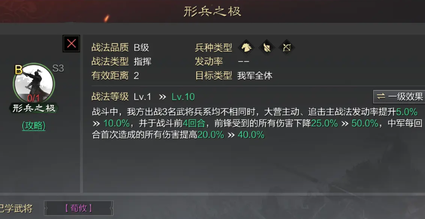战法搭配上,孙权推荐携带形兵之极和重整旗鼓,前者提升全队战法发动率并强化前锋减伤,后者提供稳定的群体恢复。刘备适合利兵谋胜和绝水遏敌,兼顾输出与禁疗效果,进一步削弱敌方恢复能力。曹操作为前锋,最优选择是妖术和垒实迎击,前者补充控制干扰敌方输出节奏,后者提供减伤、规避和反击效果,极大提升生存能力。