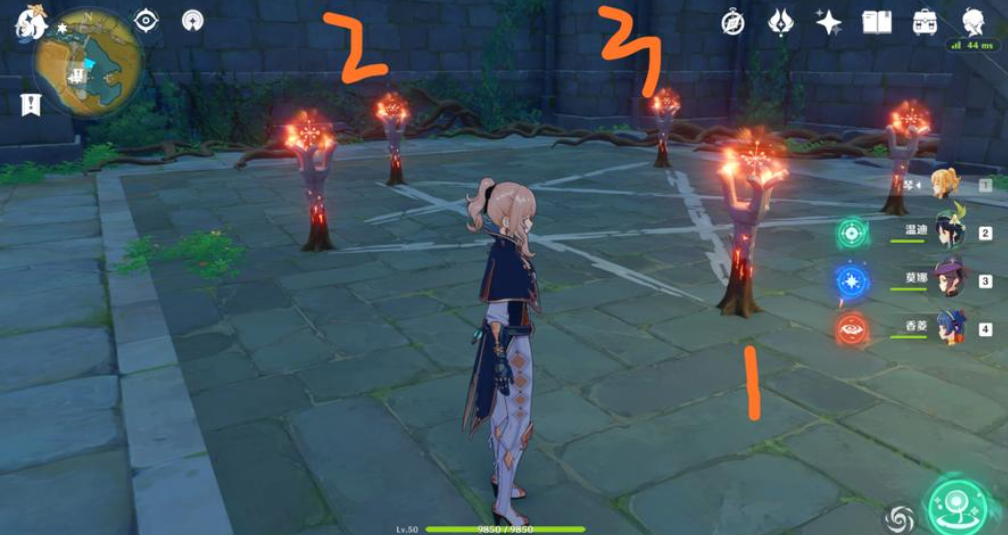 第一个塔在蓝色柱子右边,主要是点火把的解密。第一层随便点亮两个火把就能通过,第二层需要按特定顺序点燃五个火把,建议观察地面的连线找规律。第三层最简单,把顶上所有火把都点燃就行。每完成一层都能拿到宝箱,记得带上火属性角色方便点火。爬塔时要注意时间限制,动作得快点儿。