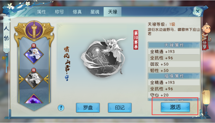 游龙、锦鲤等早期天禄因印记属性成长值较高,应优先升至满级;其余天禄中,攻击类推荐选择真气、攻击、命中、躲闪印记,防御类优选气血、防御、命中、躲闪印记。内圈天禄建议升至30级满级,外圈当前赛季天禄同步满级,非赛季天禄保持20级即可。升级顺序上,先集中资源培养核心天禄,再逐步覆盖历史天禄以激活更多印记属性。