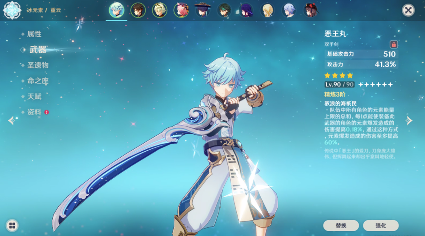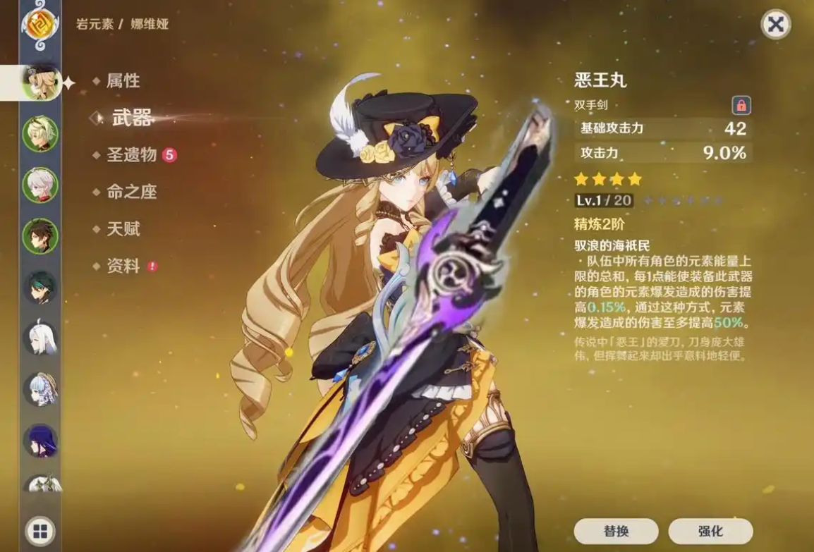 恶王丸的强度主要体现在元素爆发增伤上,适合依赖大招输出的双手剑角色。它的被动效果会根据队伍中所有角色的元素能量上限总和来提升装备者的大招伤害,精炼等级越高加成越明显。突破后基础攻击力可达510点,副词条为攻击力百分比,进一步强化输出能力。想要发挥它的最大威力,记得搭配高能量需求的队友。