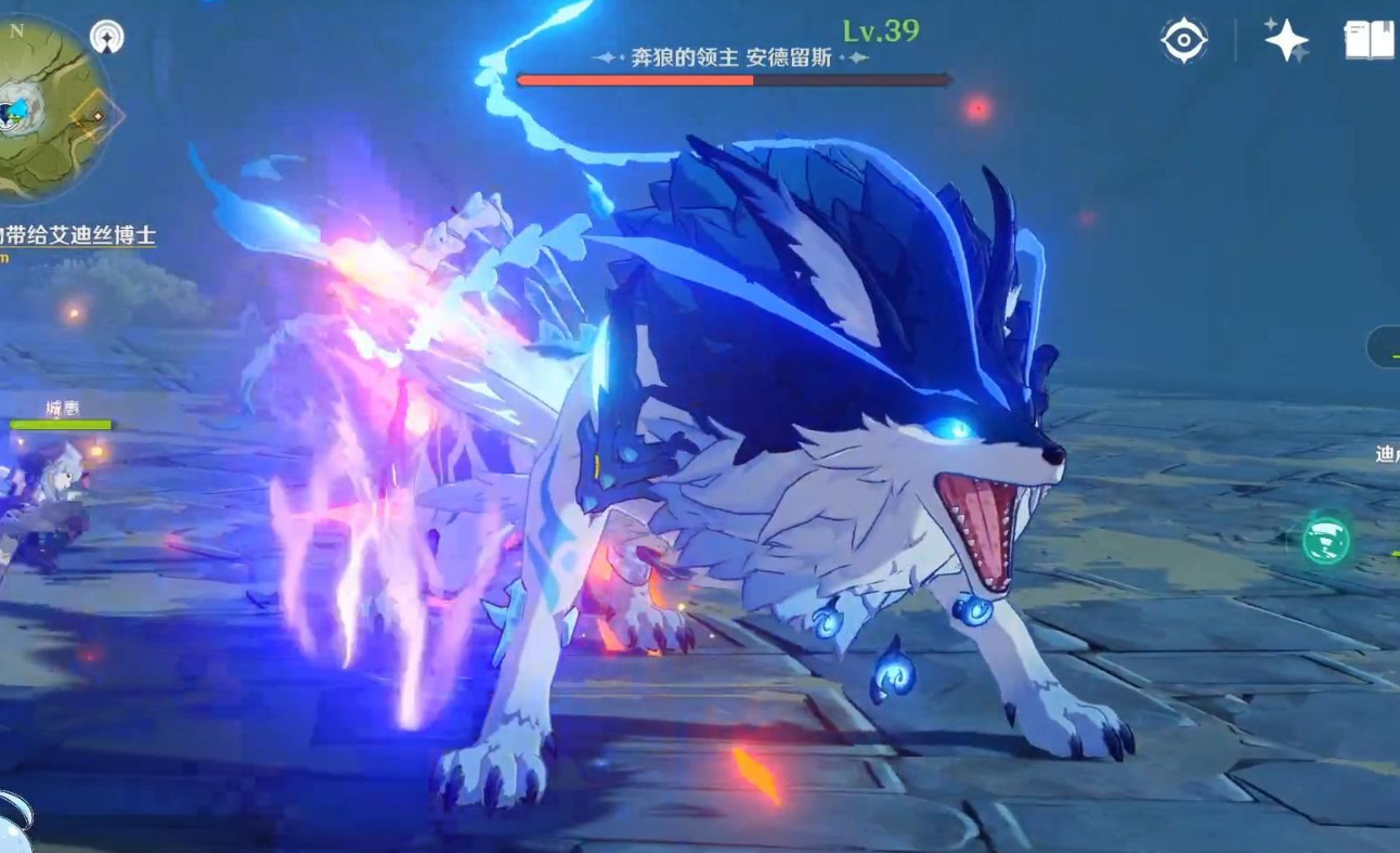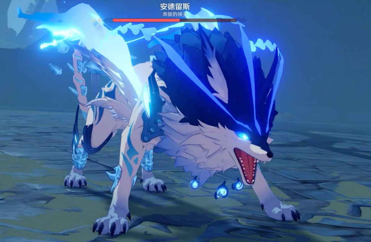 变身后的安德留斯常驻场地中央,释放冰棱突刺时地面会短暂显示红圈,需保持移动;狂风振啸会持续造成全场风元素冲击,建议贴近BOSS以减少伤害,或切换护盾角色抵挡。当BOSS长啸召唤狼影围杀时,需通过走位规避狼影的直线冲锋。此阶段可提前使用耐寒药剂和防风药剂,分别提升35%冰、风元素抗性。