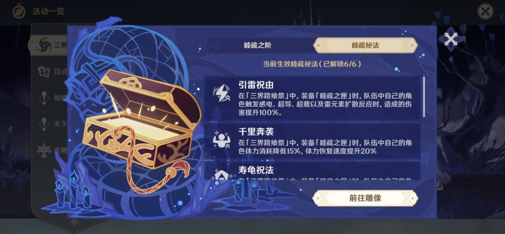 供奉睦疏之匣需要收集活动道具光界之印,通过探索渊下宫区域并完成活动任务或挑战可获得。提升睦疏之匣等级至4级时,玩家将直接获得精炼等级为1的证誓之明瞳;继续升级至5、9、10、14级时,可额外获取精炼材料明月之油膏,用于提升武器精炼等级至最高5阶。