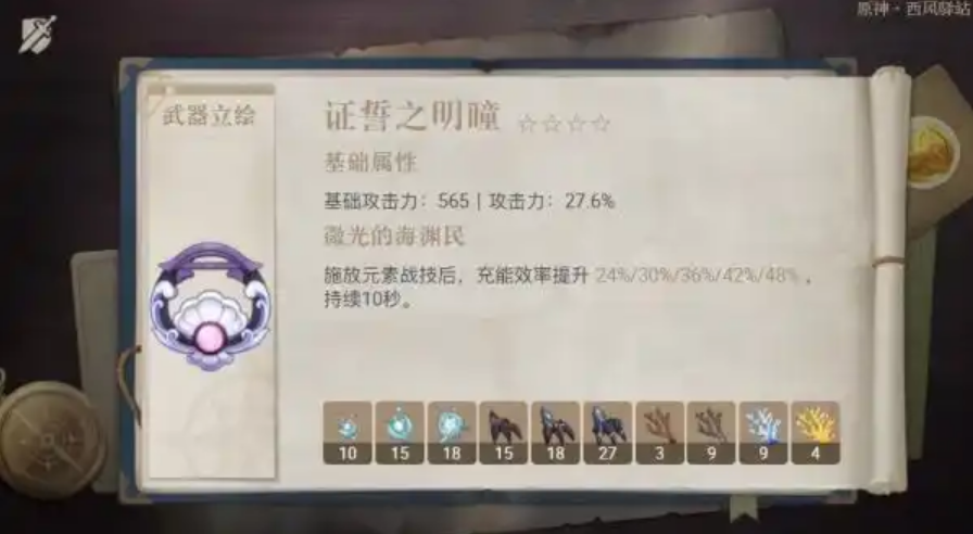 证誓之明瞳的武器特效为微光的海渊民,施放元素战技后提升角色24%元素充能效率,持续10秒。其副词条为攻击力加成,基础攻击力在四星法器中属于较高档位,适合依赖元素爆发或需要频繁释放战技的角色使用。突破材料包括远海夷地的瑚枝、隐兽指爪和浮游干核等,需提前准备以提升武器等级。