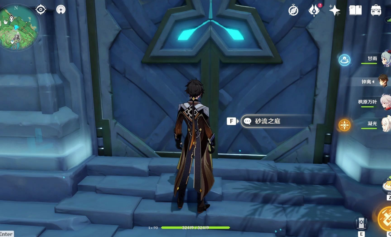 要开启砂流之庭旁边的地牢,首先需要传送到砂流之庭附近的锚点。滑翔进入砂流之庭右侧的山洞,在山洞内部的台阶上着陆后,沿着台阶向上攀爬至顶部,可以找到一个隐蔽的洞口。从该洞口进入即可到达地牢内部。这一路径不需要解谜或特殊条件,但需注意地形较为复杂,建议携带具有攀爬优势的角色。