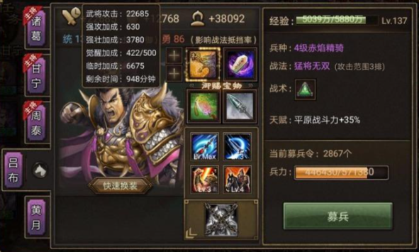 对于刚起步的小伙伴来说,孙策、周瑜、诸葛亮、曹操、典韦这套阵容也很友好。孙策和周瑜的吴国组合能打出不错的AOE伤害,诸葛亮提供控制和增益,曹操和典韦则是稳定的前排。这套阵容的优势在于武将获取难度较低,前期就能凑齐,而且培养成本不高,适合资源有限的玩家。最后再推荐一套以曹操为核心的阵容:曹操、黄月英、甘宁、吕布、周泰。这套阵容的特点是攻守兼备,曹操和黄月英提供稳定的控制和辅助,甘宁和吕布负责输出,周泰则是可靠的前排。