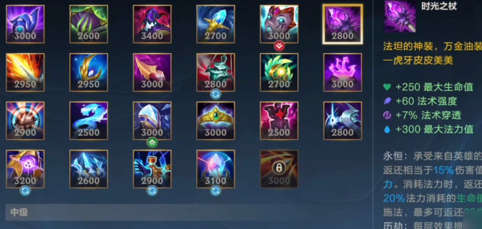 时光之杖是法师英雄最常见的回蓝选择,其被动敬畏增加相当于1%最大法力值的法术强度,并返还25%总法力消耗。这件装备还具备法力积攒特性,每次消耗法力都会增加最大法力值,女神之泪作为其前置装备,同样提供法力积攒效果,是许多法师前期过渡的关键装备。这些法术回蓝装备特别适合瑞兹、卡萨丁等耗蓝量大的AP英雄。