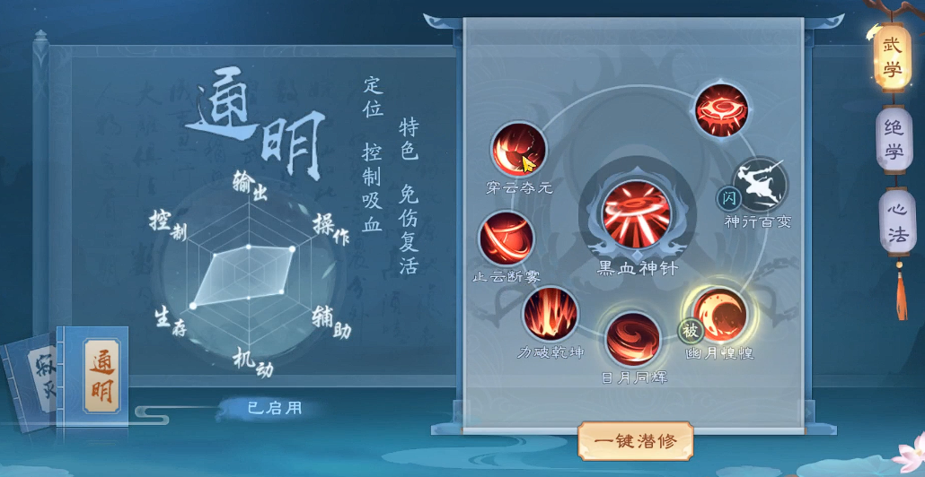 通用心法建议优先点出减CD和吸血效果,比如风往火复能减少魔影重重的冷却时间,让咱们更频繁地释放关键技能。PVP场景可以侧重控制类天赋,比如闲庭信步增强减速效果,方便后续连招命中。如果是副本挑战,记得点出焚符破玺降低怪物防御,提升团队输出效率。心法层数越高,解锁的加成越强,所以平时多积累修为和通犀丸,尽早突破境界。
