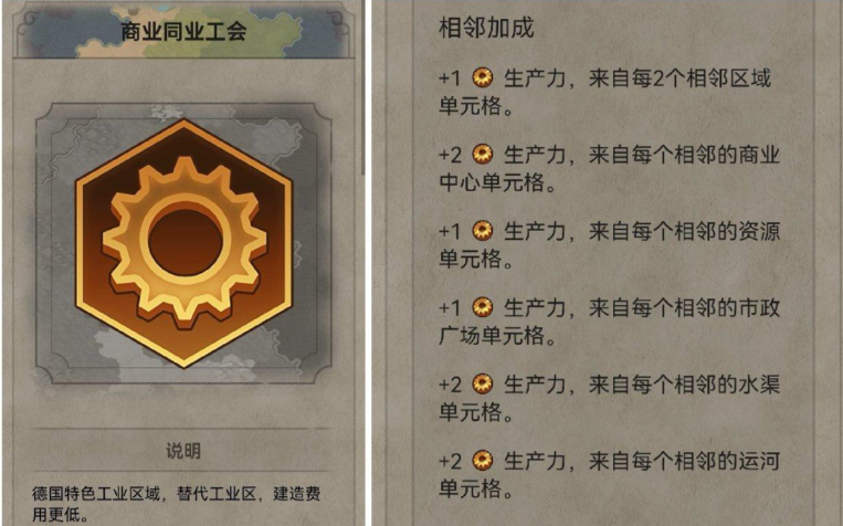 想用德国文明玩出工业巨头的风采,核心秘诀就在于对其特色工业区汉萨的深入理解和精妙规划。德国文明的独特能力让它天生就是为工业化而生的强者,不仅每个城市都能比别国多建一个区域,为工业区腾出宝贵空间,其特色工业区汉萨更拥有超越普通工业区的潜力,它可以从相邻的商业中心获得大量生产力加成,并且能从邻近的每两个矿山或伐木场获得额外加成,这让它的堆叠逻辑自成一派。