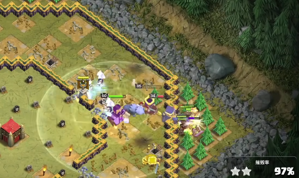 法师塔与迫击炮是胖子的头号克星,两者都具备范围溅射伤害,能同时打击扎堆的胖子部队。法师塔的攻击覆盖范围广,伤害稳定且持续,胖子成群推进时,每一次法师塔的攻击都能对多个胖子造成伤害,叠加起来掉血速度极快,即便胖子血量较高,也扛不住法师塔的持续溅射。迫击炮的攻击伤害更高,虽然攻击间隔较长,但每一发都能对范围内的胖子造成重创,尤其针对密集阵型的胖子,一发就能让多个胖子血量大幅下降,配合其他防御建筑的输出,能快速将胖子血线压至危险区间。进攻时胖子要尽量避开法师塔与迫击炮的正面射程,优先用炸弹人破墙后快速摧毁这两类防御,或用治疗法术及时抬升胖子血量,减少溅射伤害带来的损耗。
